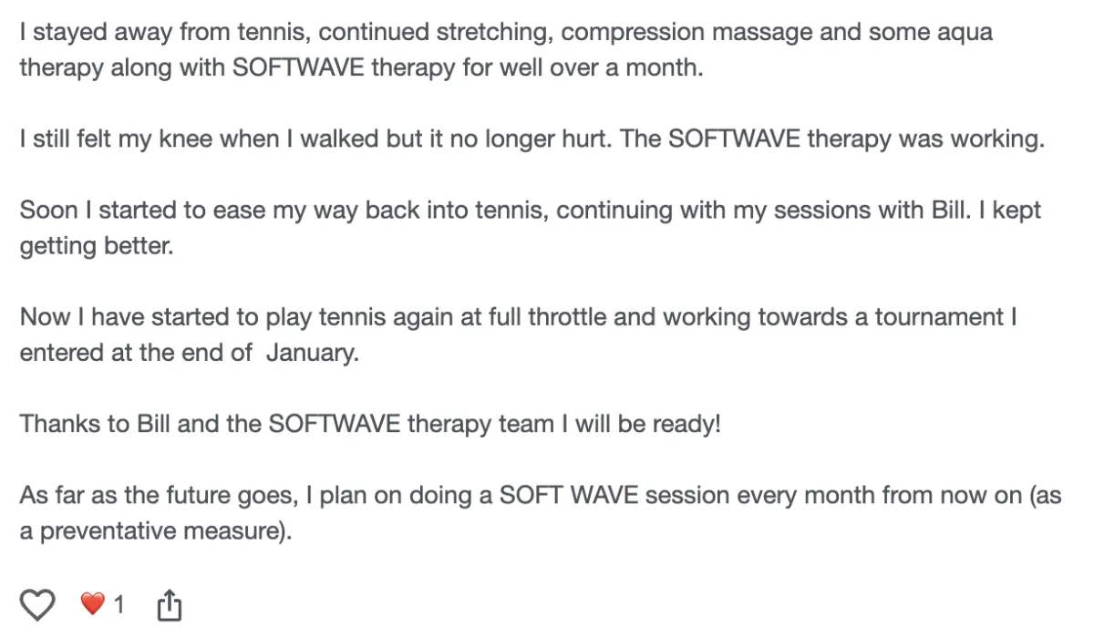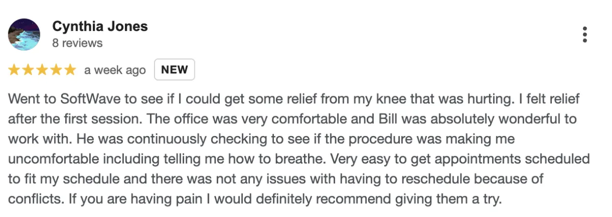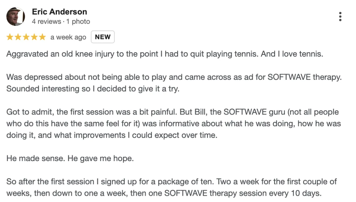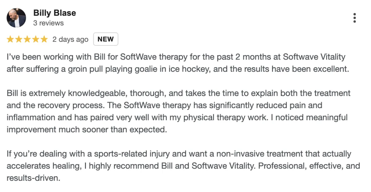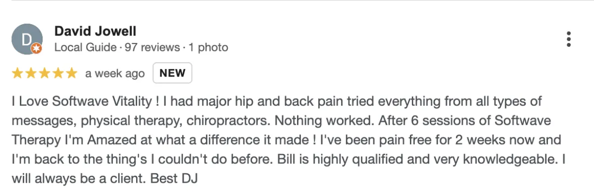 Disclaimer: Procedures and treatments performed by Softwave Vitality have an inherent success (and failure) rate. Reviews, testimonials and content on this site should not be interpreted as a statement of efficacy of procedures and treatments performed by Softwave Vitality for anyone else.